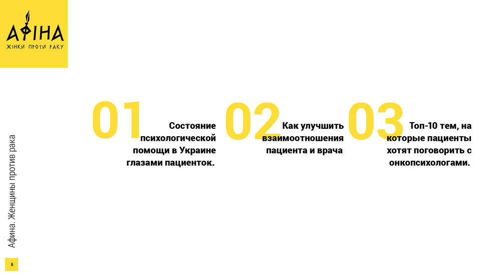 1) Состояние психологической помощи в Украине глазами пациенток 2) Как улучшить отношения пациентов и врачей 3) Топ-10 тем для обсуждения с онкопсихологом